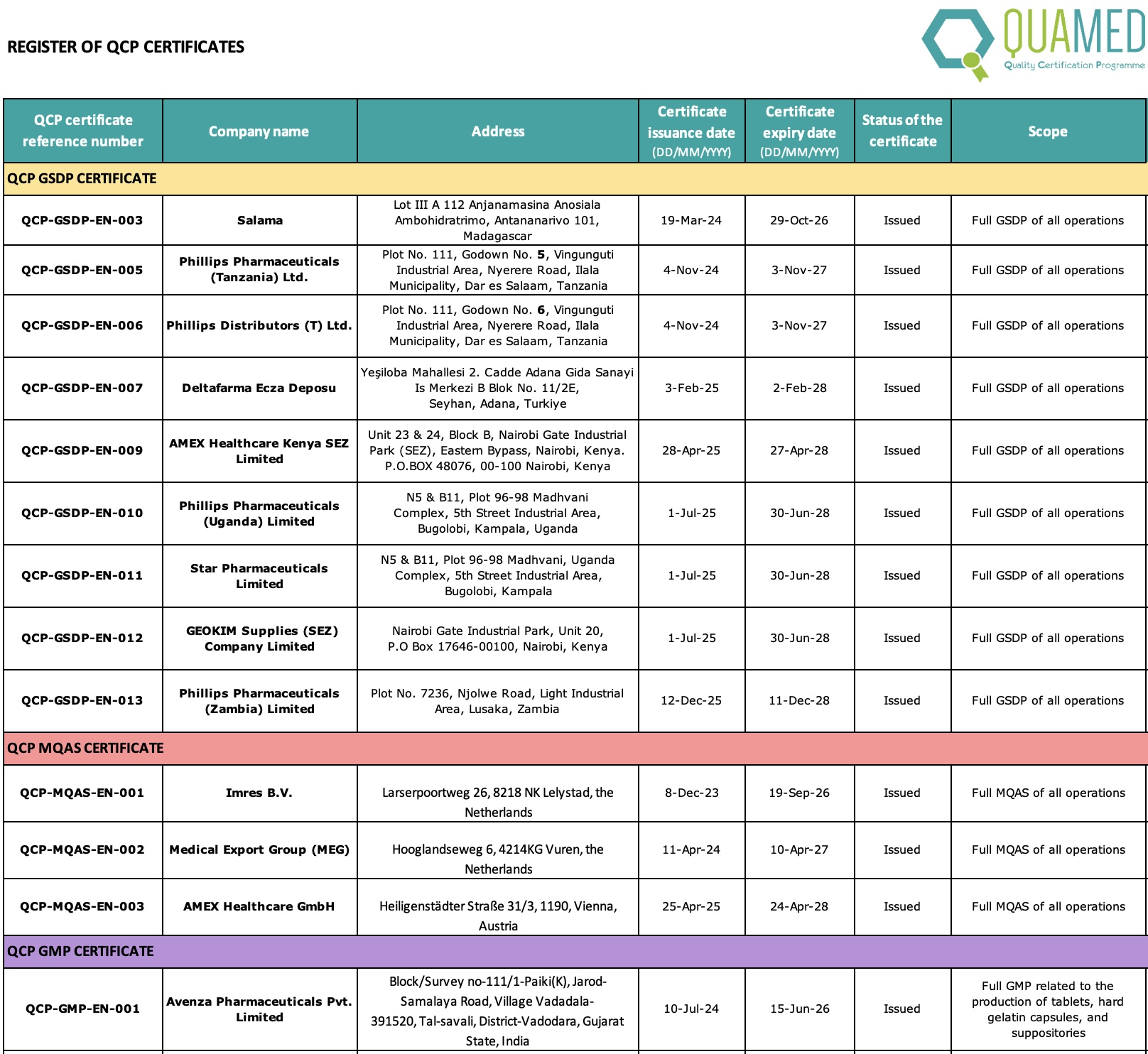 QUAMED has developed the Quality Certification Program (QCP). Through the QCP we are offering wholesalers and manufacturers an opportunity to apply for a QUAMED QCP Certification for GSDP, GMP or MQAS standards.